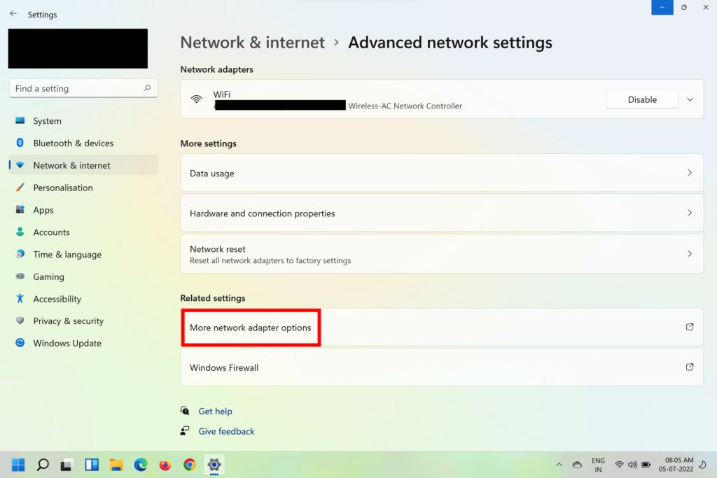 2. Kliknij naSieć i Internetopcję na pasku bocznym i wybierzZaawansowana siećustawienia.