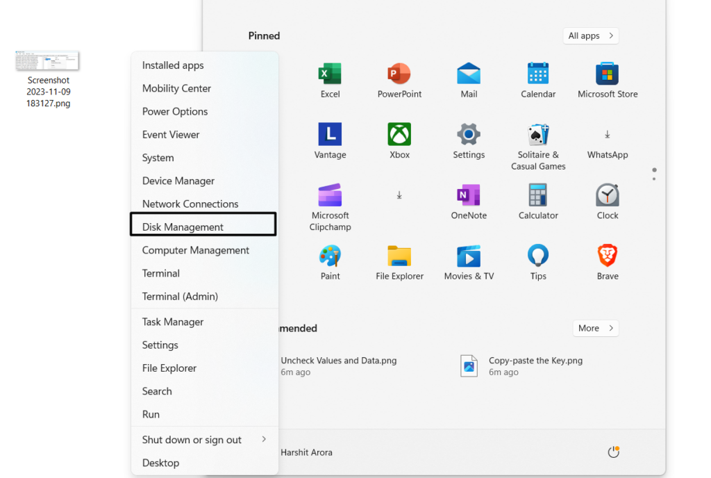 1.Użyj skrótu klawiszowego Windows + X, aby otworzyć plikMenu startowei wybierzZarządzanie dyskamiopcja.