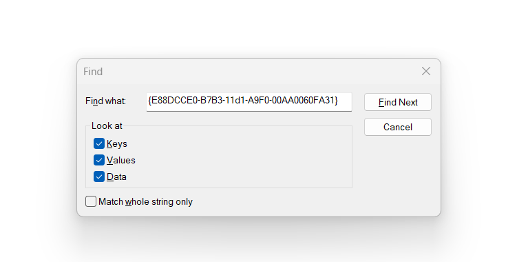 2.wEdytor rejestruokna, naciśnij Windows + F, aby otworzyćZnajdowaći skopiuj i wklej do niego poniższy klucz: