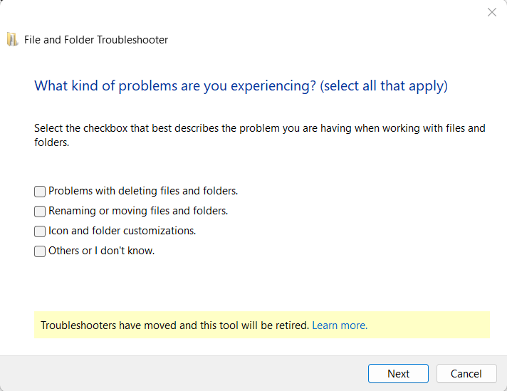 Możesz rozważyć uruchomienie narzędzia do rozwiązywania problemów z plikami i folderami systemu Windows na komputerze, ponieważ problem może dotyczyć plików i folderów. To całkiem prosteuruchom narzędzie Plik i folder systemu Windows. Poniżej wymieniliśmy kroki umożliwiające wykonanie tego narzędzia do rozwiązywania problemów w systemie Windows 11: