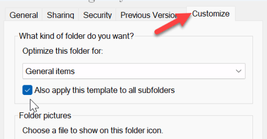 3.wDostosujzakładka, podZoptymalizuj ten folder pod kątem, zaznaczZastosuj ten szablon również do wszystkich podfolderów.