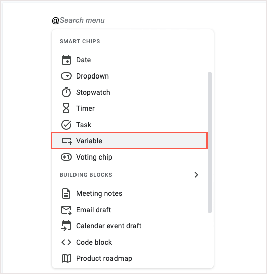 - WybieraćWstawić>Inteligentne chipy, wybieraćZmiennei wybierz nazwę zmiennej z listy podręcznej.