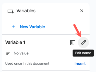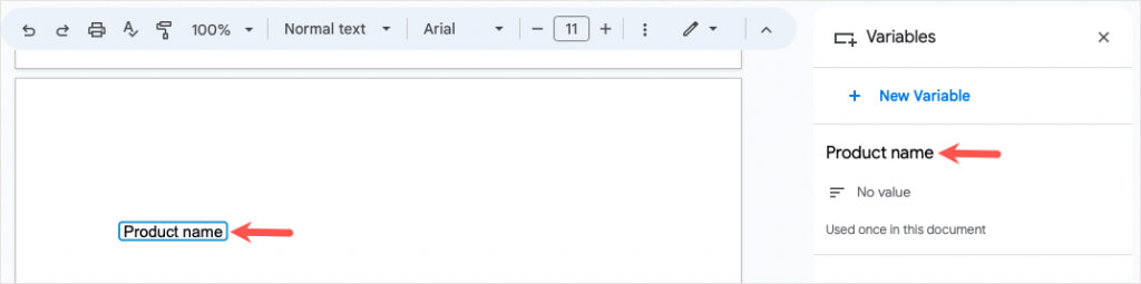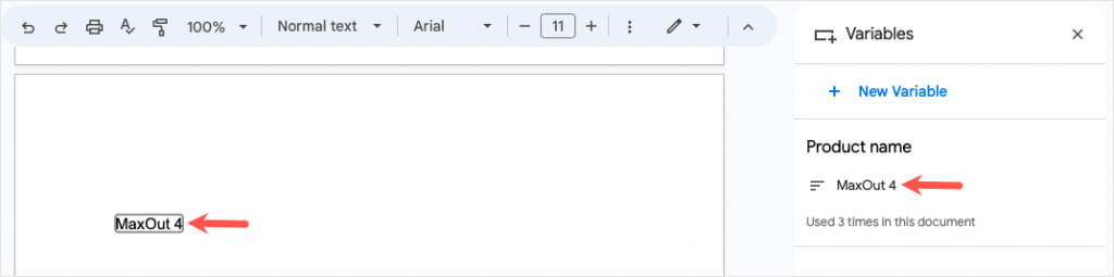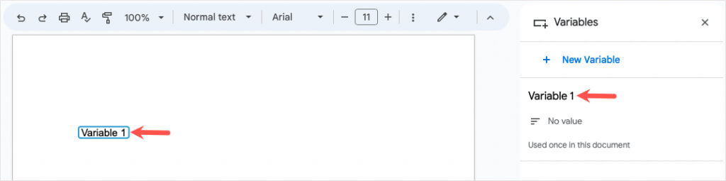 - Następnie zobaczysz zmienną z jej nazwą w dokumencie i na pasku bocznym Zmienne, który otworzy się po prawej stronie.