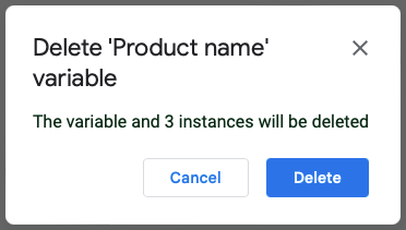 Jeśli zdecydujesz, że nie chcesz już używać zmiennej, możesz ją usunąć. Pamiętaj, że spowoduje to usunięcie zmiennej i jej wartości, jeśli została przypisana, z każdej lokalizacji w dokumencie.