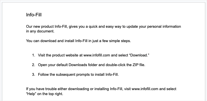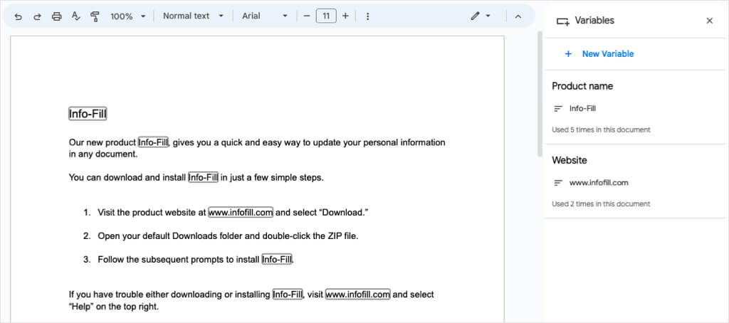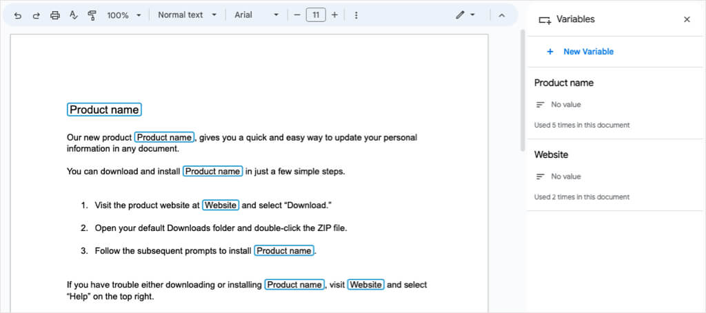 Tutaj tworzymy dokument dla nowego produktu naszego klienta. Nie mamy jeszcze nazwy produktu ani adresu strony internetowej, więc zamiast tego wstawiamy zmienne dla tych dwóch pozycji. Po otwarciu paska bocznego Zmienne są one widoczne w całym tekście z niebieskim obramowaniem.