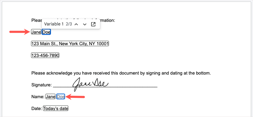 Kiedy udostępniamy dokument, odbiorca po prostu wybiera każdą zmienną i wprowadza swoje informacje. Zmienne, które są używane więcej niż raz, są aktualizowane automatycznie.