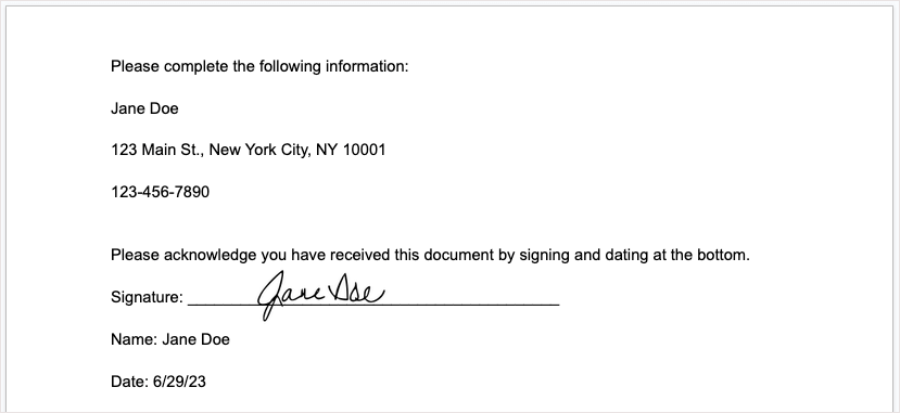 W następnym przykładzie mamy dokument, który chcemy, aby ktoś inny uzupełnił swoimi danymi. Konfigurujemy zmienne dla imienia, nazwiska, adresu, numeru telefonu i daty.