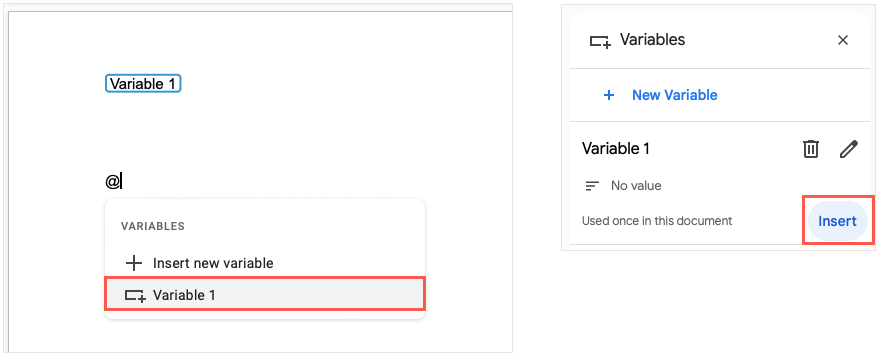 - Otwórz pasek boczny Zmienne, najedź kursorem na zmienną, której chcesz użyć, i wybierzWstawić.