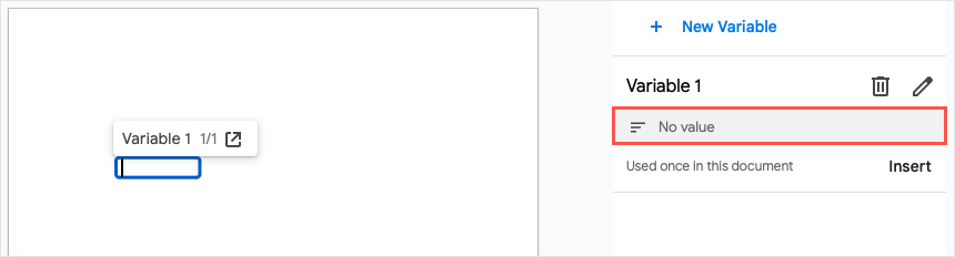Po dodaniu zmiennej do dokumentu możesz w dowolnym momencie przypisać jej wartość. Wartością jest tekst, którego chcesz użyć. Możesz to zrobić w samej zmiennej lub na pasku bocznym.