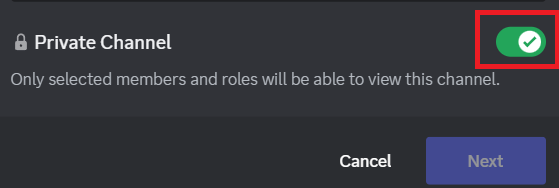 3.Jeśli chcesz, aby tylko wybrana osoba mogła oglądać kanał lub dołączyć do niego, włącz przełącznikKanał prywatnyi kliknijNastępnyprzycisk.