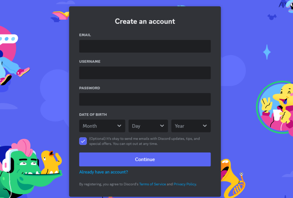 5.Jeśli nie, kliknijRejestrprzycisk. Na następnej stronie uzupełnij dane i kliknijKontynuowaćprzycisk. Discord poprosi o weryfikację, a gdy to zrobisz, utworzy Twoje konto.