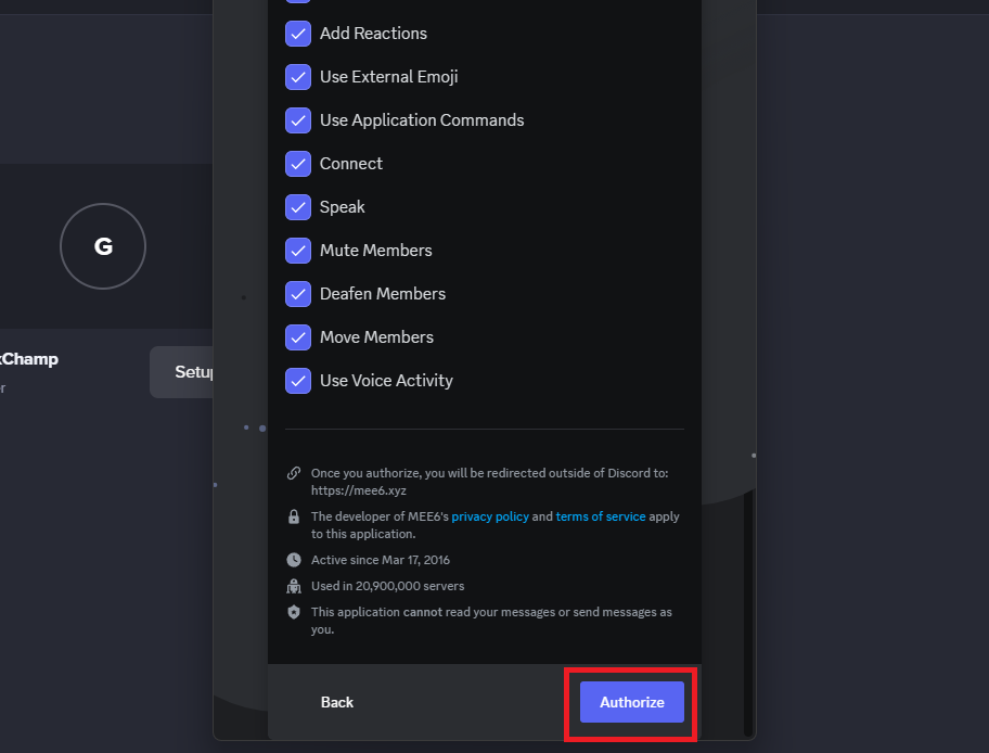 6.Wybierz rzeczy, do których chcesz, aby bot miał dostęp, i kliknijAutoryzowaćprzycisk, a bot zostanie dodany do serwera.