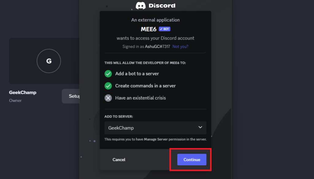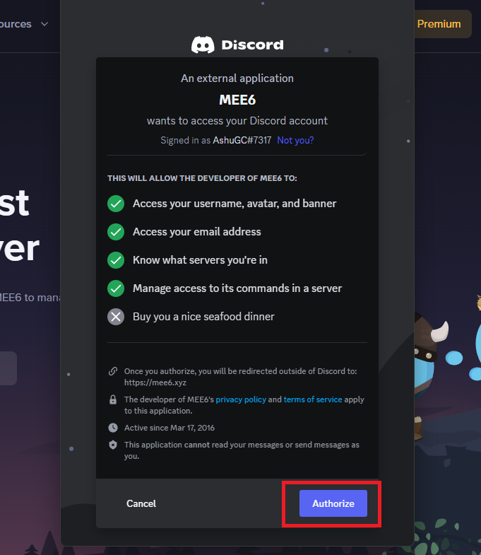3.Autoryzuj bota, aby uzyskać dostęp do Twojego konta Discord.