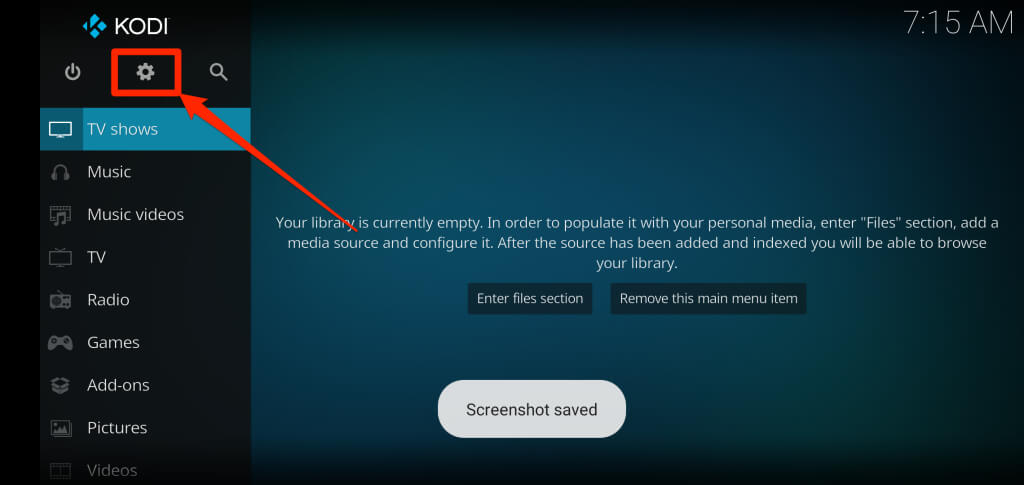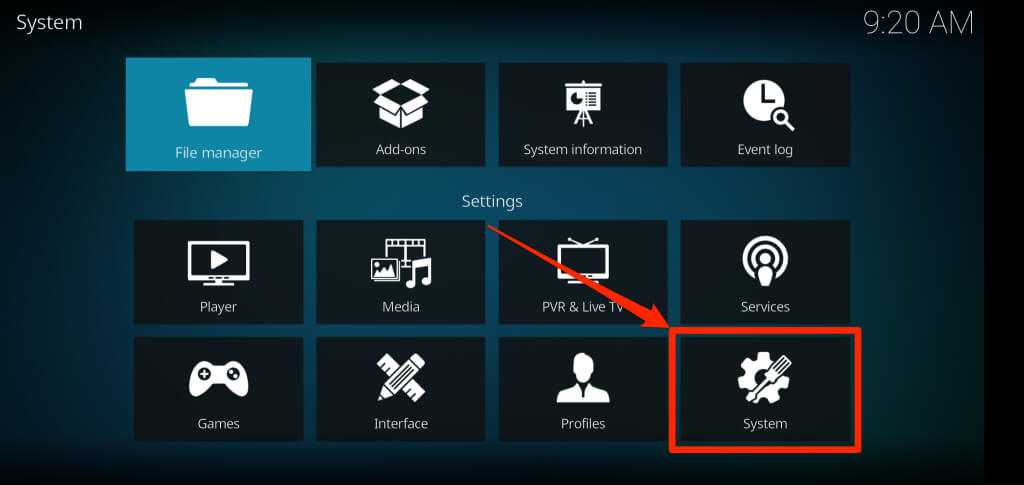 - Otwórz Kodi i dotknijikona koła zębategow lewym górnym rogu.