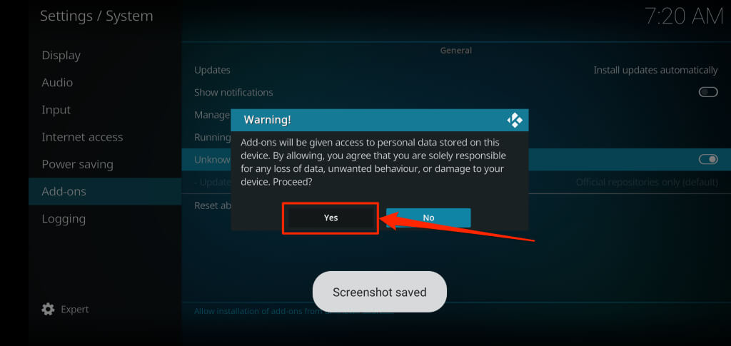 - Kodi wyświetli monit podkreślający ryzyko instalowania dodatków z nieznanych źródeł. UzyskiwaćTakkontynuować.