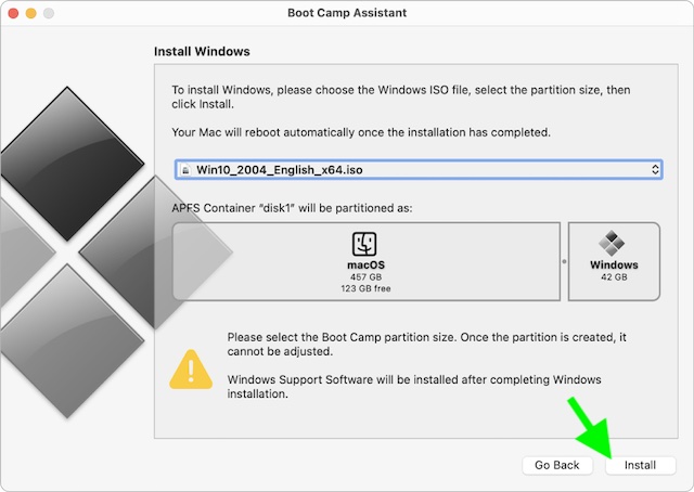 4.Na wypadek, gdybyś miał tylko jeden dysk wewnętrzny, wybierz opcjęObraz ISO systemu Windows. Następnie pamiętaj o określeniu rozmiaru partycji, przeciągając separator widoczny między partycjami macOS i Windows. Następnie uderzZainstalowaćkontynuować.