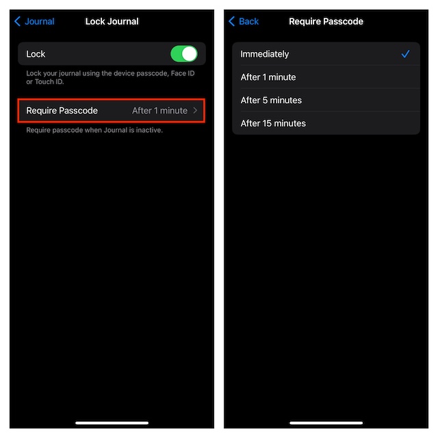 Jeśli chcesz, aby Face ID natychmiast blokował aplikację Journal zaraz po jej zamknięciu, wybierz opcję „Natychmiast”. Ponieważ ta funkcja bezpieczeństwa zaczyna działać od razu, nie musisz się już martwić o ochronę swoich prywatnych dzienników.