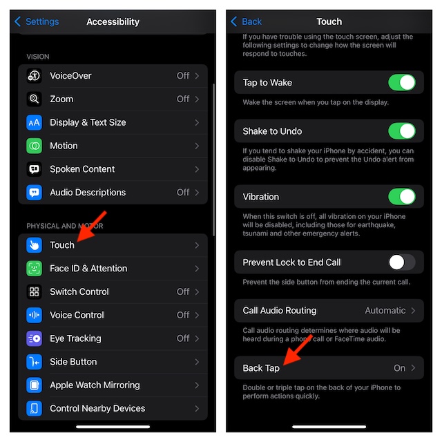 - Teraz przewiń w dół ekranu i wybierz„Dotknięcie tyłu”.