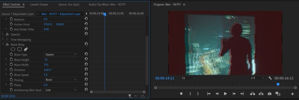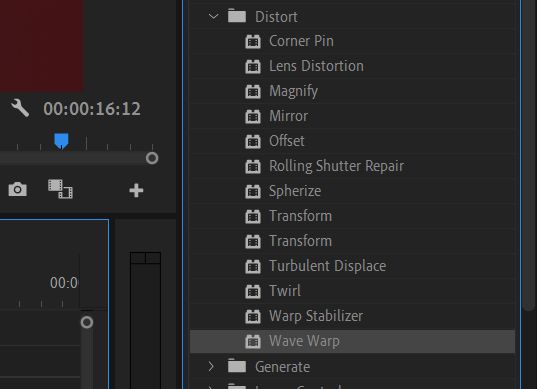 Innym dobrym sposobem na poprawienie wyglądu materiału filmowego jest efekt zniekształcenia Wave Warp. Spowoduje to segmentację wideo według wzoru przypominającego falę, przypominającego efekt linii skanowania VHS, chociaż można łatwo sprawić, aby wyglądało to bardziej na usterkę, bawiąc się elementami sterującymi efektami.
