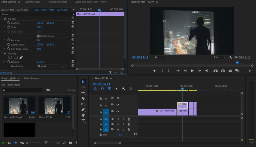 - Wybierz jeden ze zduplikowanych klipów i przejdź doKontrola efektówpłyta. Idź doNieprzezroczystośćwartość i ustaw ją na50%. Następnie podRuchmenu rozwijane, zmieńPozycjawartości, tak aby zduplikowany klip nakładki nieznacznie różnił się od oryginału. Wykonaj ten krok również z resztą duplikatów. Będziesz chciał zmienić pozycję i ewentualnie wartości skali, aby urozmaicić usterkę. Możesz także grać w trybie mieszania, aby uzyskać inny wygląd.