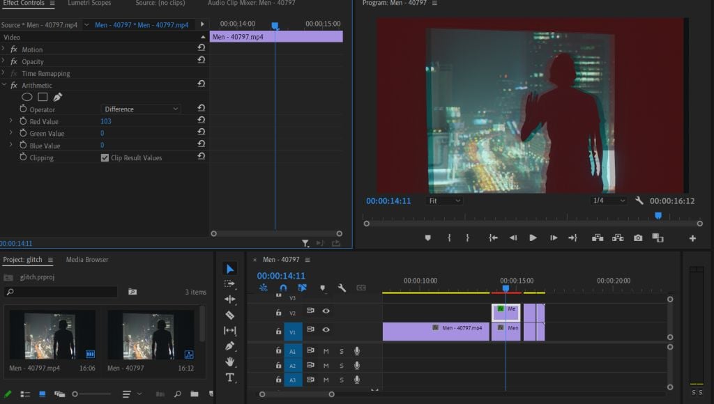 Aby uzyskać dobry efekt glitch artu, warto trochę pobawić się wartościami RGB zduplikowanych klipów wideo. Może to dać więcej zepsutego efektu VHS lub kamery. Oto jak to zrobić, korzystając z efektu arytmetycznego.