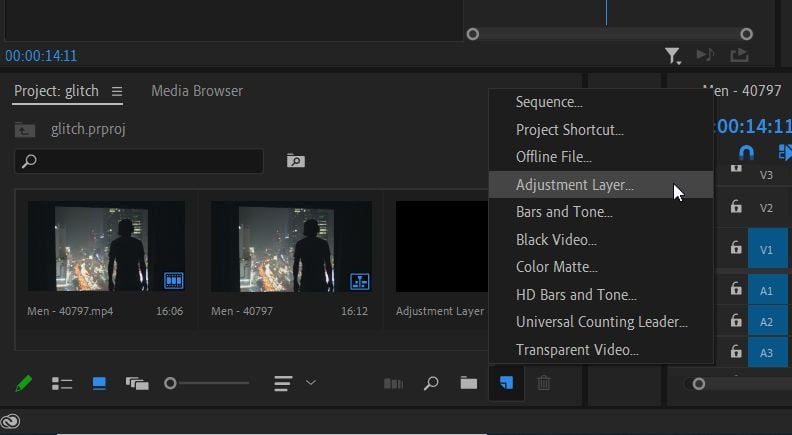 - Najpierw dodaj warstwę dopasowania, aby zastosować efekt fali zarówno do oryginalnych, jak i zduplikowanych klipów. Przejdź do prawego dolnego rogu panelu Projekt i wybierzNowy element > Warstwa dopasowania. Następnie przeciągnij utworzoną warstwę z panelu Projekt na oś czasu V3 nad pociętymi klipami.