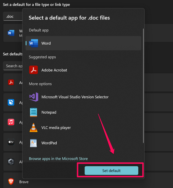 3.Typ.docw pasku wyszukiwania podUstaw wartość domyślną dla typu pliku lub typu łączasekcję i naciśnij klawisz Enter.