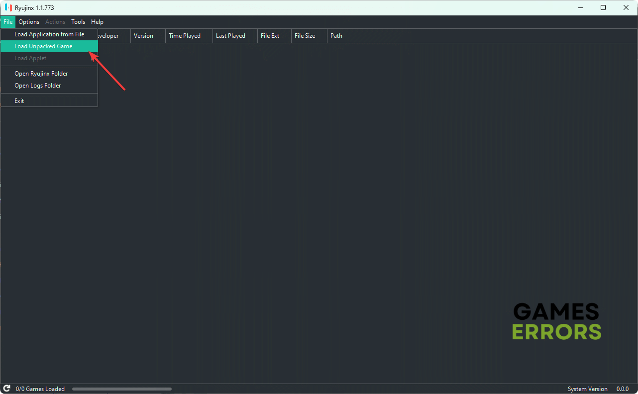 6. W Ryujinx kliknij Plik, a następnie Załaduj rozpakowaną grę lub Załaduj aplikację z pliku, w zależności od pobranego pliku gry.