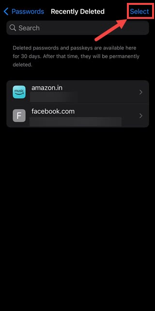 8.Jeśli chcesz odzyskać wiele haseł jednocześnie, przejdź do sekcji „Ostatnio usunięte” i dotknijWybieraćw prawym górnym rogu.