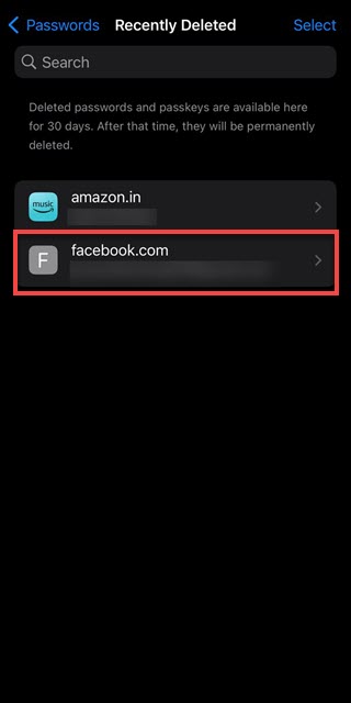 3.W sekcji „Hasła” dotknij opcjiOstatnio usunięteopcja.