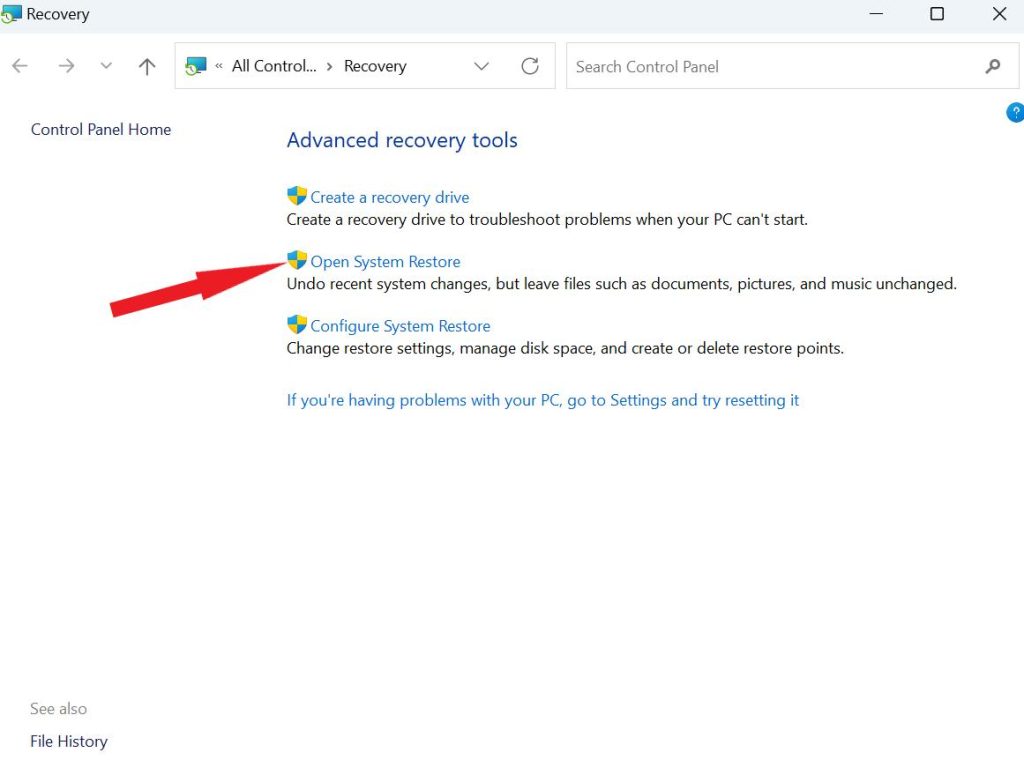 Krok 2:Kliknij„Otwórz przywracanie systemu”.