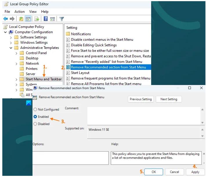 W Edytorze zasad grupy systemu Windows 11 znajduje się ustawienie umożliwiające wyeliminowanie obszaru Zalecane z menu Start, ale jest mały haczyk. Wersja systemu Windows 11 SE obsługuje to ustawienie i jest przeznaczona dla urządzeń z niższej półki w celach edukacyjnych. W przyszłości kolejne edycje mogą mieć tę samą lub podobną oprawę. Aby uzyskać dostęp do tego ustawienia zasad, wykonaj następujące kroki:
