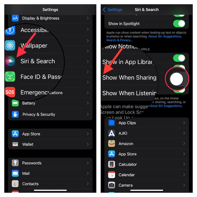 3.W sekcji „Sugestie od Apple” wyłącz przełącznik obokPokaż podczas udostępnianiaa następnie zamknij aplikację.