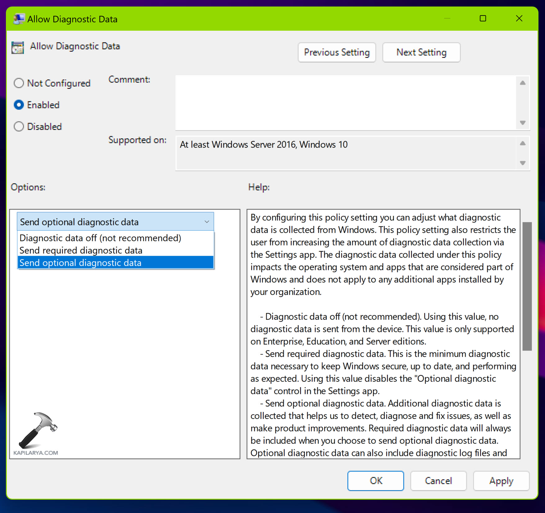 4. Ustaw zasadę na Włączoną, w Opcjach wybierz Wyślij opcjonalne dane diagnostyczne. Kliknij Zastosuj, OK.
