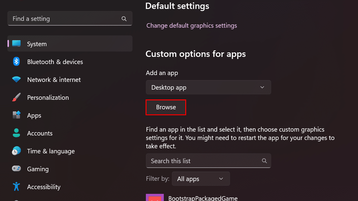 - KliknijPrzeglądaćprzycisk, aby wybrać aplikację.