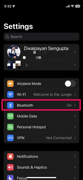 8.Teraz,uruchom aplikację Ustawieniana swoim iPhonie i przejdź doBluetooth.