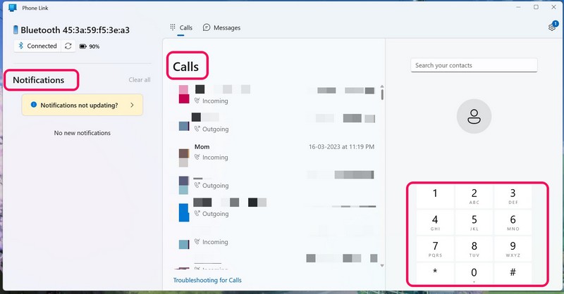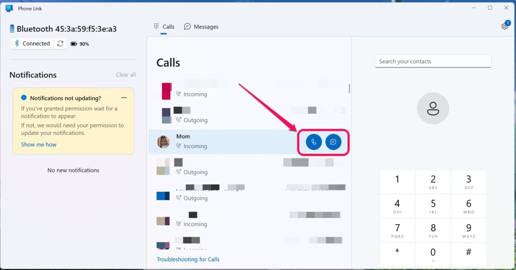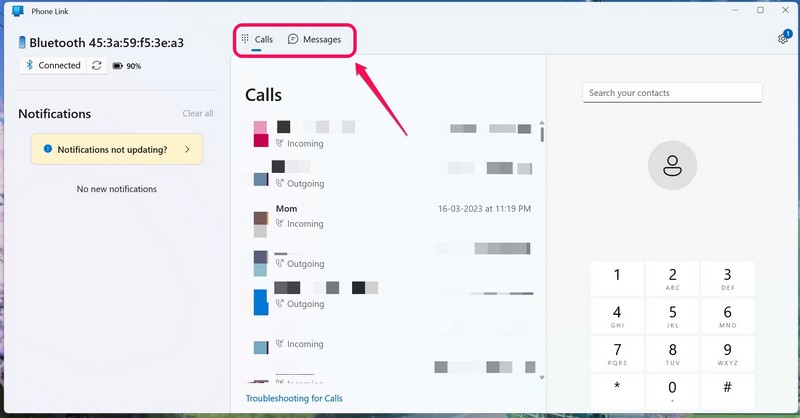 Teraz, gdy wszystko jest już skonfigurowane, przyjrzyjmy się, jak używać aplikacji Phone Link do dzwonienia do kontaktów z komputera lub laptopa z systemem Windows 11 oraz jak możesz także wysyłać i odbierać wiadomości (tak, iMessages też!) na komputerze.