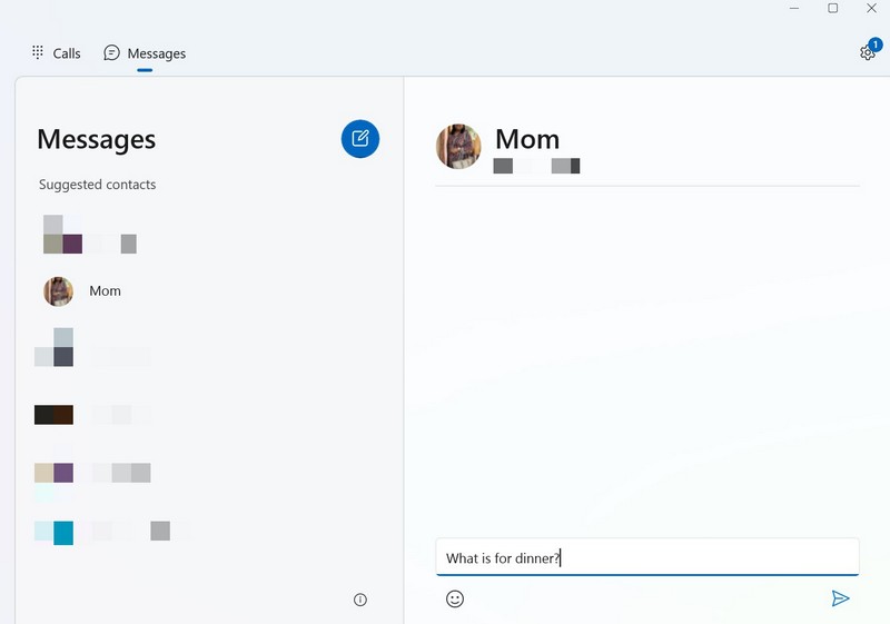 6.KliknijWiadomośćaby utworzyć nową wiadomość w aplikacji Phone Link i wysłać ją do odbiorcy bezpośrednio z komputera, niezależnie od tego, czy jest to wiadomość iMessage czy SMS.