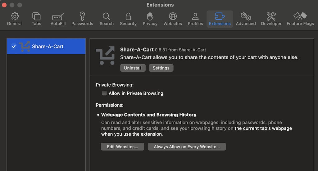 - Na komputerze Mac podążaj ścieżkąPreferencje>Rozszerzeniaaby włączyć rozszerzenie Share-A-Cart.