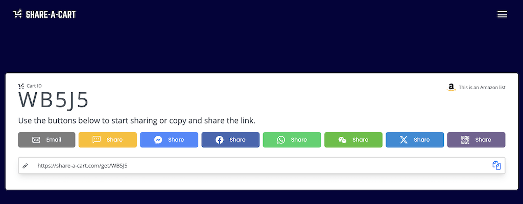 - Pod kodem zobaczysz swój identyfikator koszyka Amazon z opcjami udostępniania. Możesz to zrobićSkopiuj kodi udostępnij go komuś ręcznie lub wybierzUdziałaby otworzyć więcej opcji.