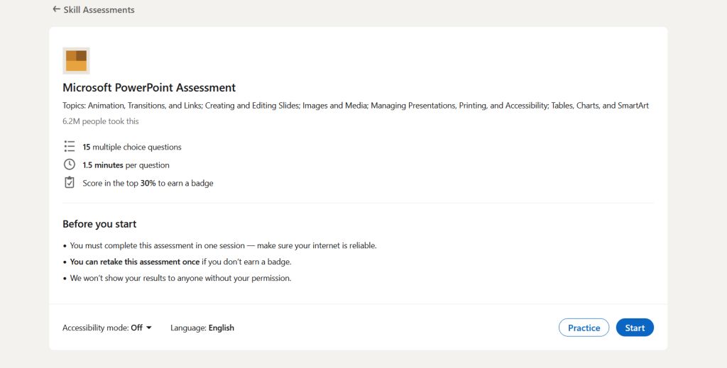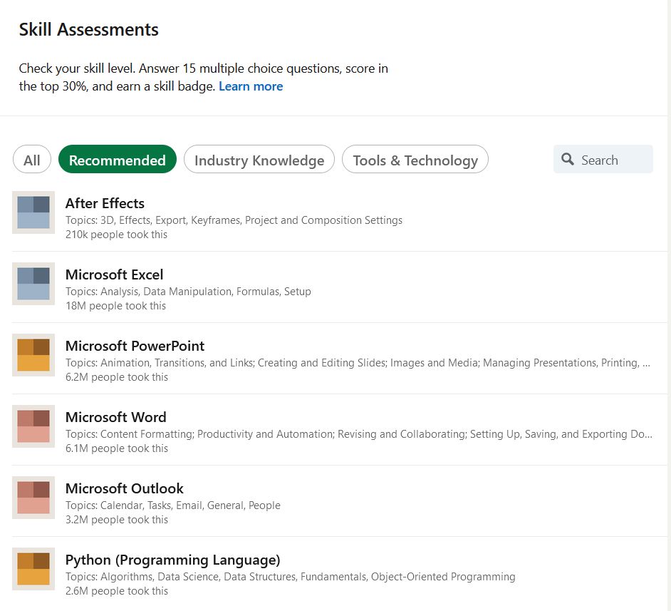 Jeśli chcesz zaprezentować swoją wiedzę techniczną, LinkedIn udostępnia funkcję oceny umiejętności, w ramach której zadawane są pytania dotyczące tych programów. Jeśli pracujesz w dziedzinach związanych z informatyką, możesz znaleźć wiele ocen, takich jak CSS, Java i JavaScript, Python, HTML, Linux, uczenie maszynowe i inne.