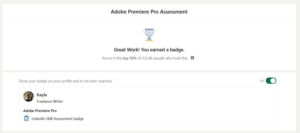 Jeśli znalazłeś się w górnych 30%, dobra robota! Dzięki LinkedIn zdobędziesz odznakę umiejętności. Obok tekstu „Pokazuj swoją odznakę na swoim profilu i w wyszukiwaniach rekrutacyjnych” upewnij się, że przełącznik jest włączony. W ten sposób Twój profil, a zwłaszcza sekcja Umiejętności, będą wyglądać znacznie bardziej imponująco.
