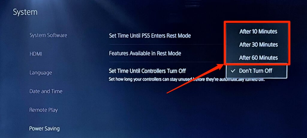 - WybieraćOszczędzanie energiina pasku bocznym i wybierzUstaw czas do wyłączenia kontrolerów.