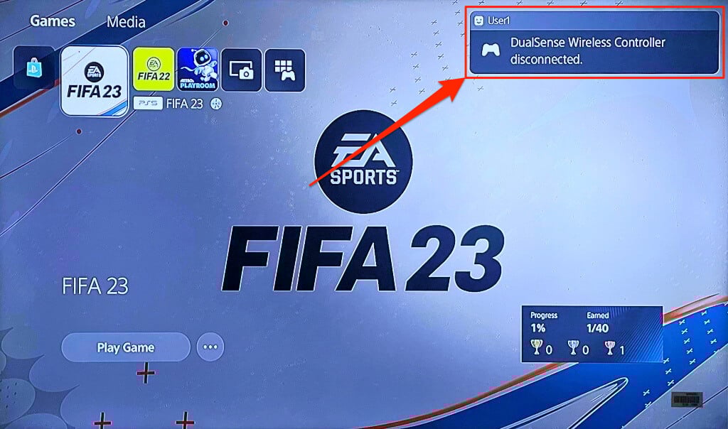 Powinieneś zobaczyć AKontroler bezprzewodowy DualSense jest odłączonyalert w prawym górnym rogu ekranu.