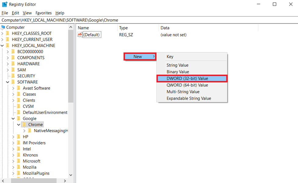 6. Teraz, wybierzNowyopcja, zatemWartość DWORD (32-bitowa).z podmenu i zakończ proces wywołując nowy kluczDoNotUpdateToEdgeWithChromium.