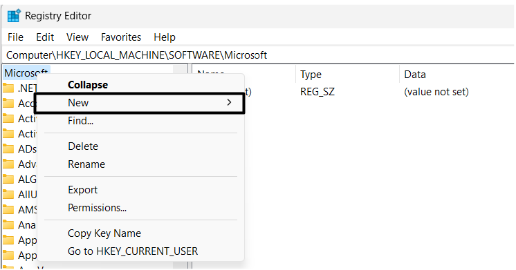 4.Teraz,kliknij prawym przyciskiem myszynaFolder Microsoftu,wybieraćNowy,a następnie wybierzKlawiszz podanych opcji, aby utworzyć nowy klucz.