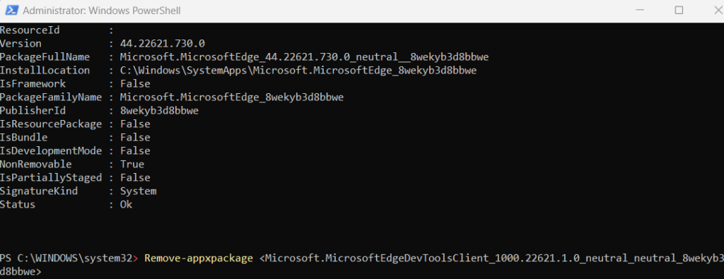 Remove-appxpackage <PackageFullNamw>Notatka:Musisz wymienićPełna nazwa pakietutekst z nazwą pakietu skopiowaną wcześniej wKrok 4.