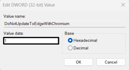 7.Po utworzeniu klucza DoNotUpdateToEdgeWithChromiumkliknij dwukrotniena nim, aby otworzyć jego właściwości i dodać1wDane wartościpole.