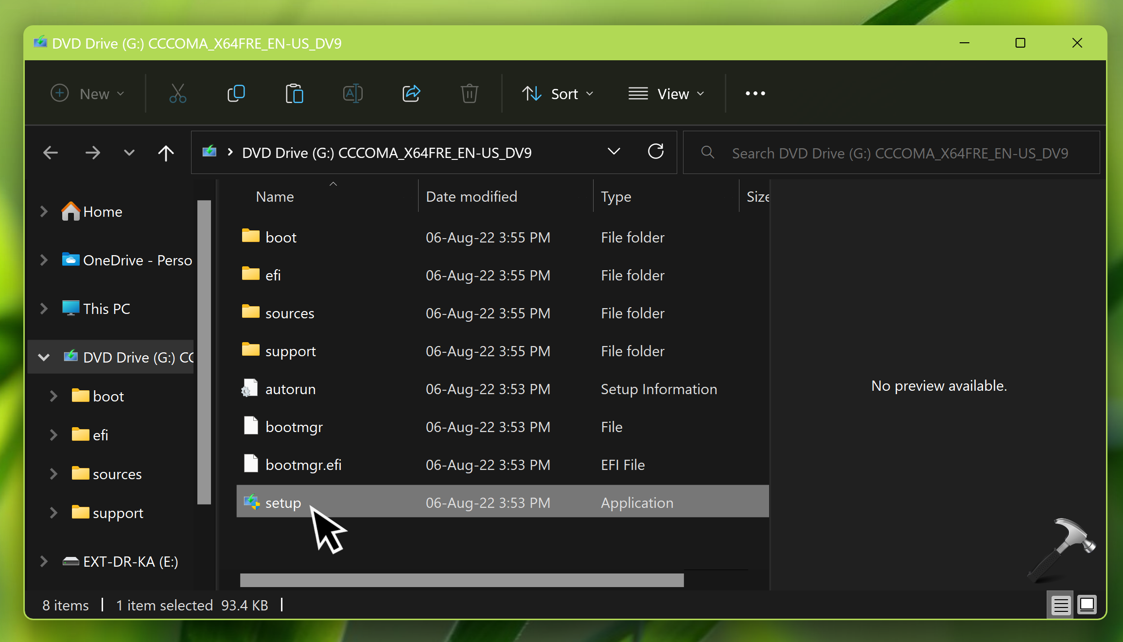 2. Po zamontowaniu pliku otworzy się okno Eksploratora plików. Zostaniesz przeniesiony do napędu DVD, do którego został podłączony. Kliknij dwukrotniesetup.exeplik, aby go uruchomić.