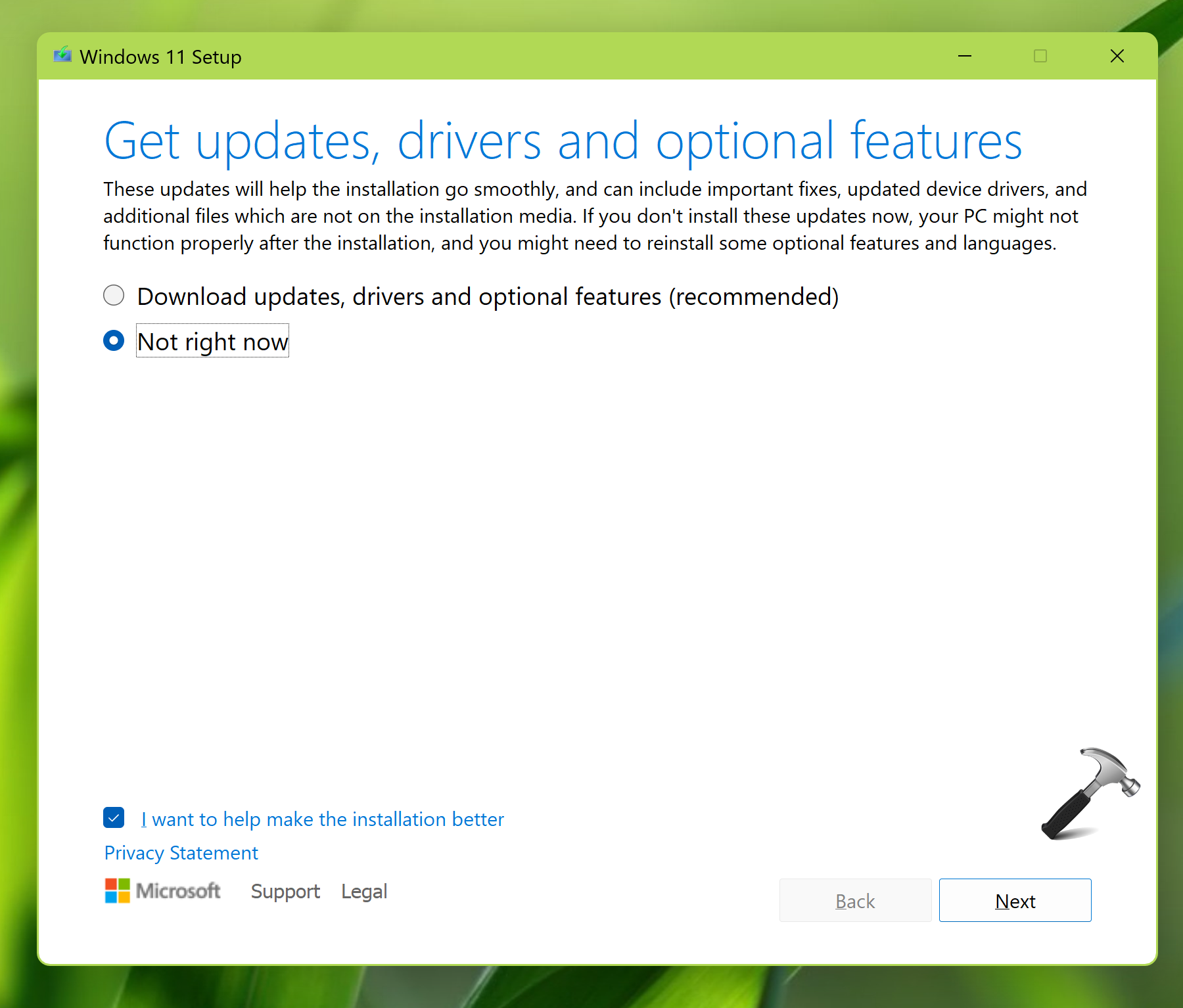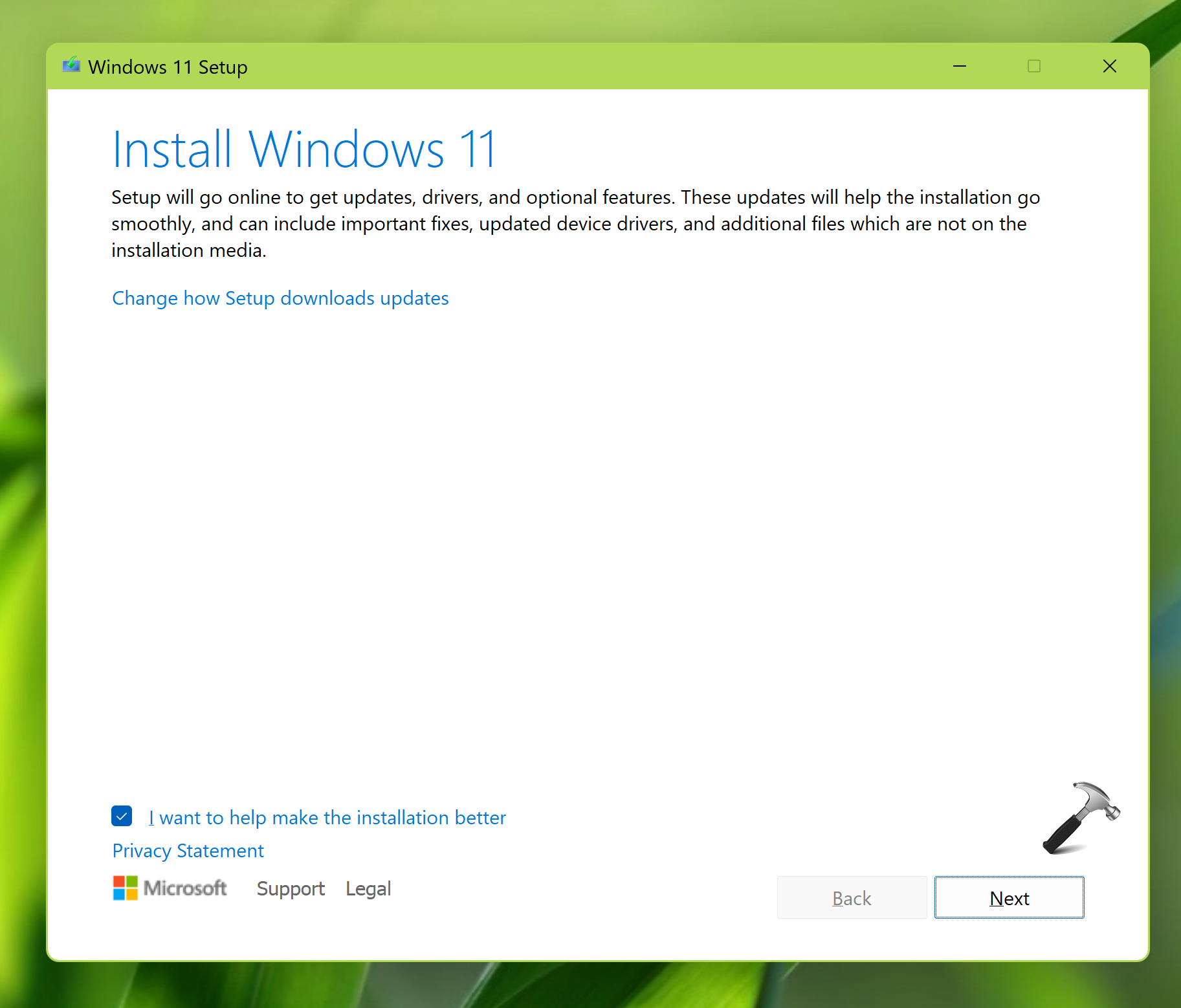 4. Na początkowym ekranie instalacji systemu Windows 11 kliknij opcję Zmień sposób pobierania aktualizacji przez instalatora.